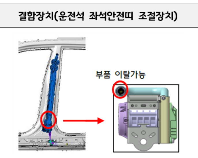 □ 국토교통부(장관 노형욱)는 현대자동차㈜에서 제작, 판매한 베뉴 등 2개 차종 129대는 운전석 좌석안전띠 조절장치의 일부 부품이 이탈되고, 이로 인해 사고 발생 시 탑승자가 상해를 입을 가능성이 확인되어 시정조치(리콜)에 들어간다.