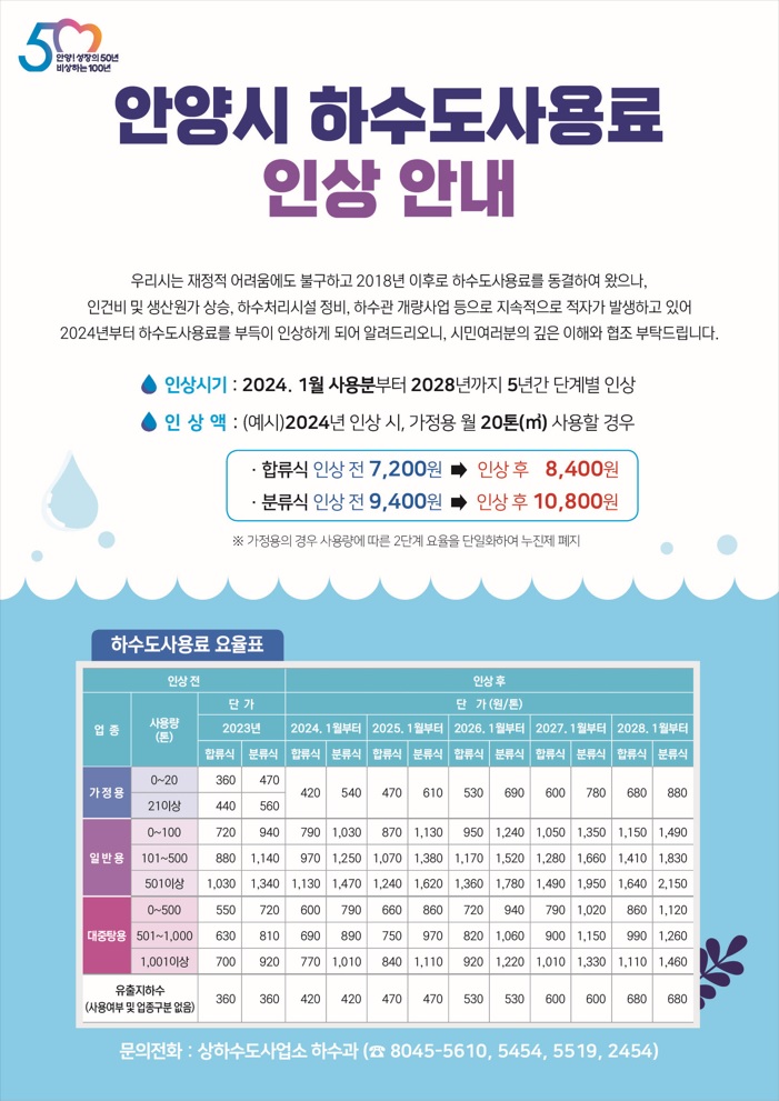 "본 저작물은 '안양시'에서 '2023년' 작성하여 공공누리 제1유형으로 개방한 안양시 하수도사용료 인상 공고를 이용하였으며, 해당 저작물은 안양시청 홈페이지 www.anyang.go.kr 에서 무료로 다운받으실 수 있습니다."
